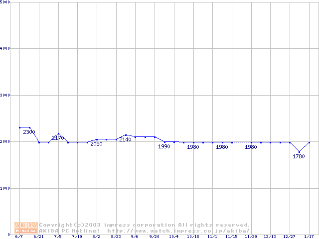 | [↑前グラフ]: | Socket A (OPGA,FSB 266MHz,L2 64KB,Applebred)の最安値推移 |