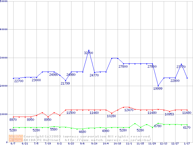 | [↓次グラフ]: | PC2100(DDR266) DDR SDRAM DIMM ECC対応の最安値推移 |