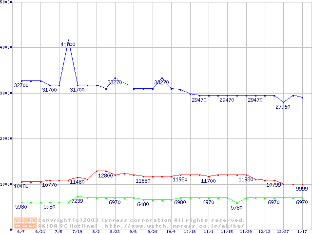 | [↑前グラフ]: | PC2700(DDR333) DDR SDRAM DIMM ECC対応の最安値推移 |