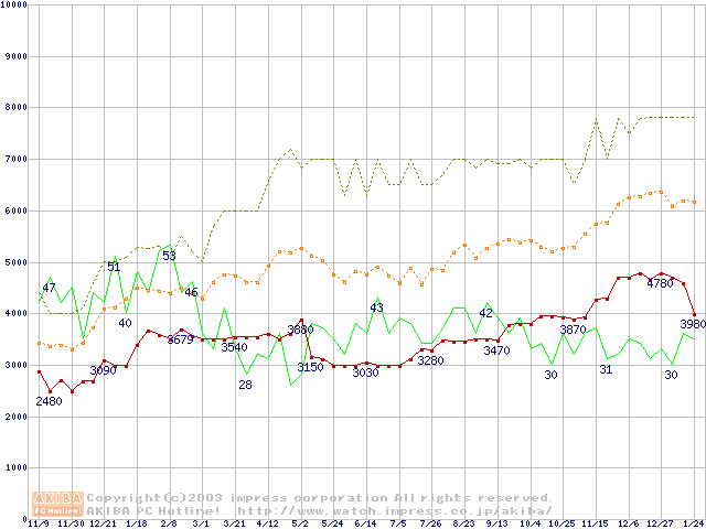 PC133 SDRAM DIMM CasLatency=3の最安値推移