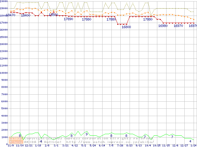 Socket 370 (FC-PGA2,FSB 133MHz,L2 512KB,Tualatin)の最安値推移