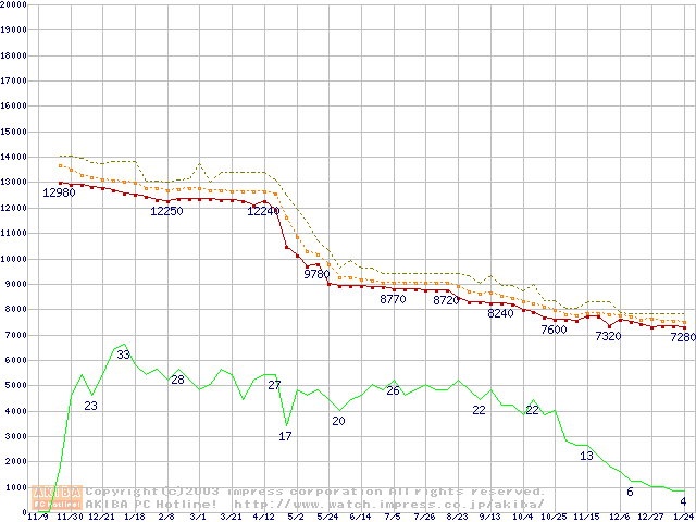 Socket 478 (micro-PGA,FSB 400MHz,L2 128KB,Northwood)の最安値推移