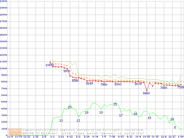 Socket A (OPGA,FSB 266MHz,L2 256KB,Thoroughbred)の最安値推移
