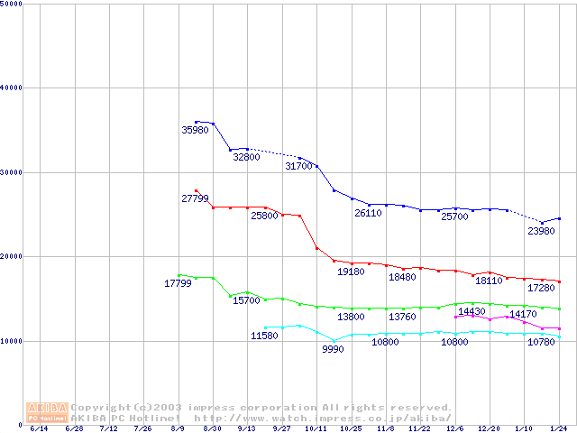 | [↑前グラフ]: | Travelstar 7K60 (9.5mm,7200rpm,UltraATA/100,8MB,FDB,30GB/Platter)の最安値推移 |