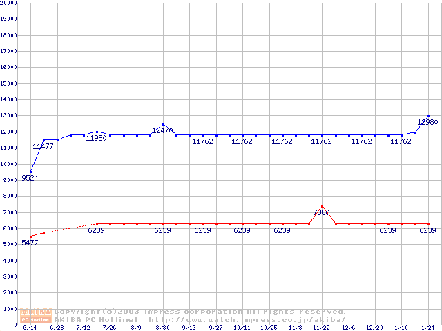 | [↓次グラフ]: | PC3200(DDR400) DDR SDRAM DIMM ECC対応 Registeredタイプの最安値推移 |