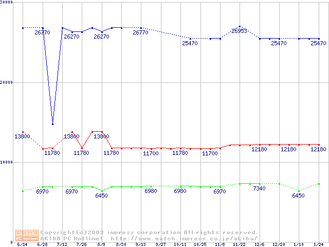 | [↑前グラフ]: | PC133 SDRAM DIMM CasLatency=3 ECC対応の最安値推移 |