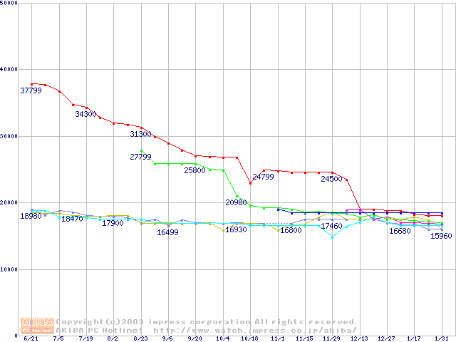 | [↓次グラフ]: | 2.5インチHDD主要製品(最安値2万円~3万円未満)の最安値推移 |