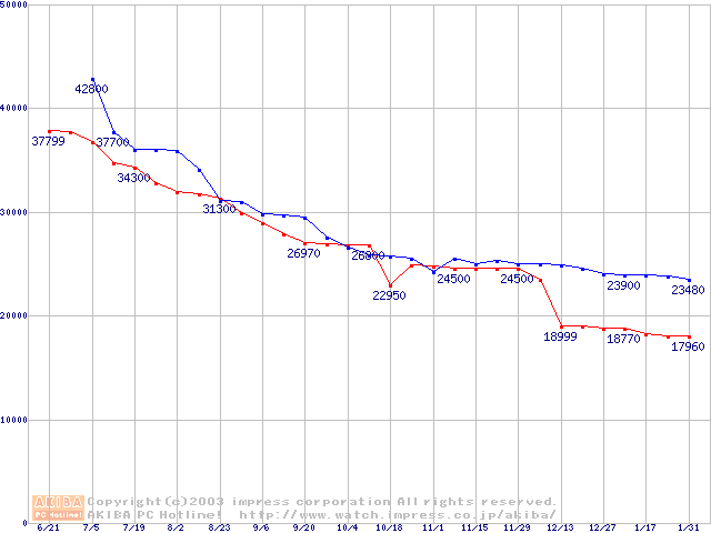 | [↓次グラフ]: | 2.5インチHDD 60GB~80GB未満(9.5mm厚,4200rpm)の最安値推移 |