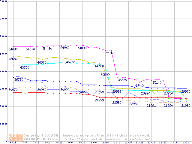 | [↓次グラフ]: | CPU主要製品(最安値3万円~6万円未満)の最安値推移 |
