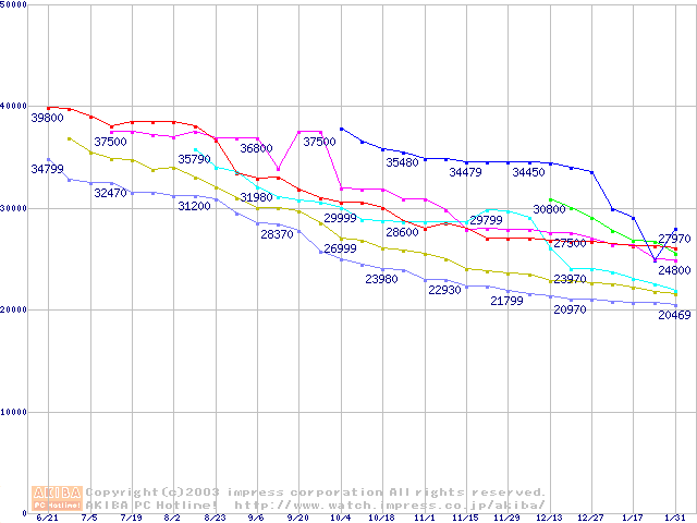 HDD主要製品(最安値1万5千円~2万円未満)の最安値推移
