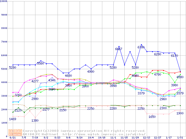 メモリ主要製品(最安値5千円~1万円未満)の最安値推移