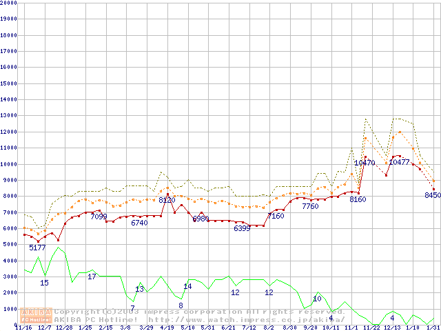 PC133 SDRAM DIMM CasLatency=2の最安値推移