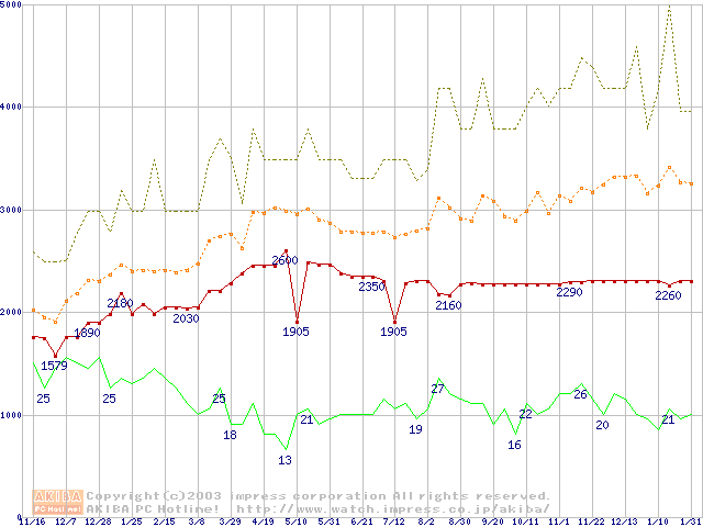 PC100 SDRAM DIMM CasLatency=2の最安値推移
