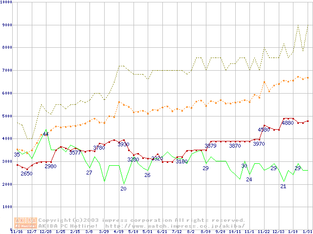 PC100 SDRAM DIMM CasLatency=2の最安値推移