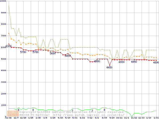 Socket A (PGA,FSB 266MHz,L2 256KB,Thunderbird)の最安値推移