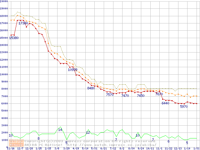 Socket A (OPGA,FSB 266MHz,L2 256KB,Thoroughbred)の最安値推移