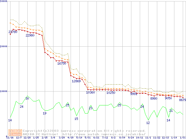 Socket A (OPGA,FSB 266MHz,L2 256KB,Thoroughbred)の最安値推移