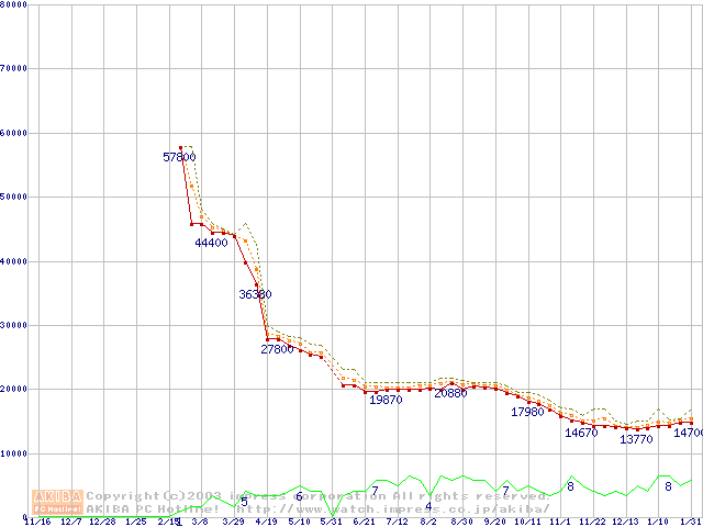 Socket A (OPGA,FSB 333MHz,L2 512KB,Barton)の最安値推移