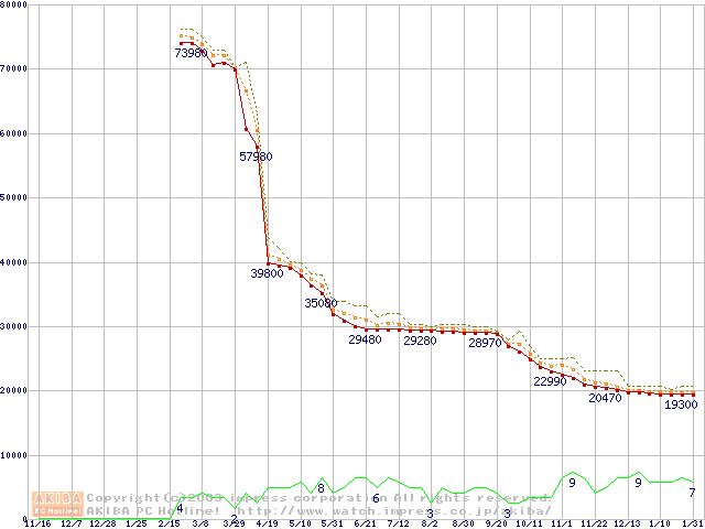Socket A (OPGA,FSB 333MHz,L2 512KB,Barton)の最安値推移