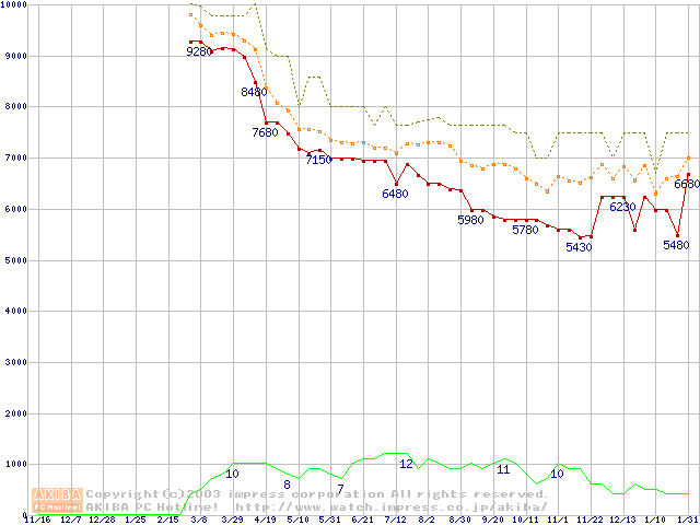 Socket A (OPGA,FSB 266MHz,L2 256KB,Thoroughbred)の最安値推移