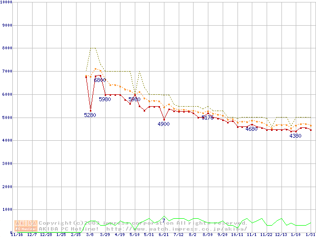 Socket 370 (PGA,FSB 133MHz,L2 64KB,Nehemiah)の最安値推移