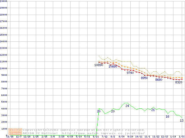 Socket 478 (micro-PGA,FSB 400MHz,L2 128KB,Northwood)の最安値推移
