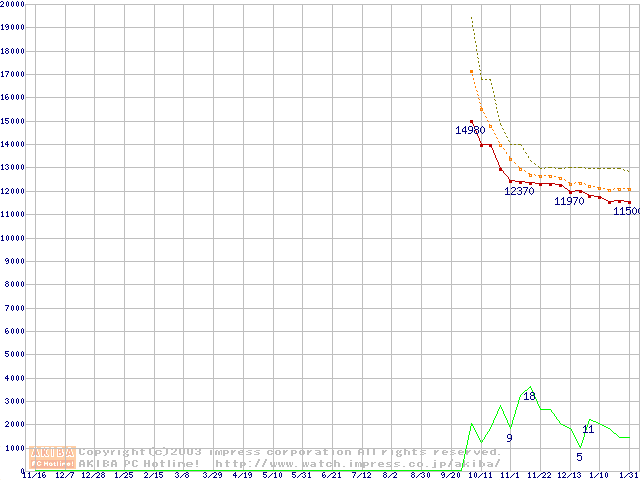HDD主要製品(最安値1万円~1万5千円未満)の最安値推移