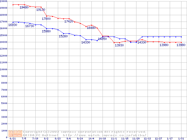 | [↓次グラフ]: | Socket A (PGA,FSB 266MHz,L2 256KB,Thunderbird)の最安値推移 |