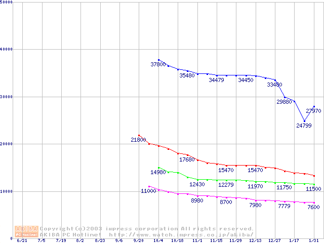 | [↓次グラフ]: | Deskstar 7K250 (7200rpm,UltraATA/100,FDB)の最安値推移 |