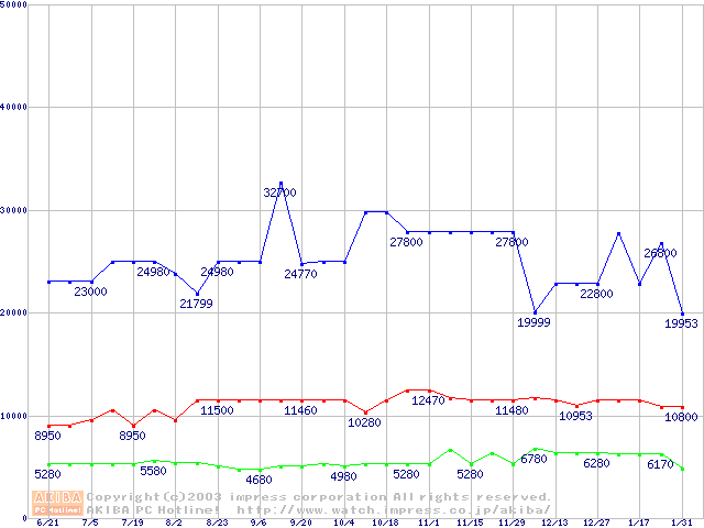 | [↑前グラフ]: | PC2100(DDR266) DDR SDRAM DIMM(CL 2.0)の最安値推移 |