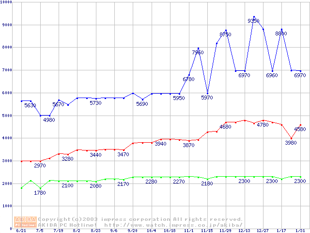 | [↓次グラフ]: | PC133 SDRAM DIMM CasLatency=2の最安値推移 |