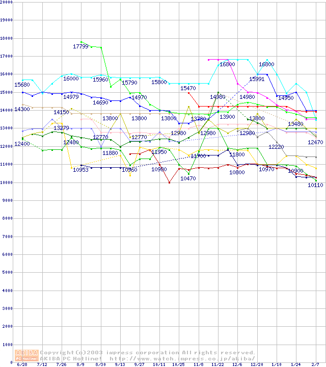 2.5インチHDD主要製品(最安値1万円~1万5千円未満)の最安値推移