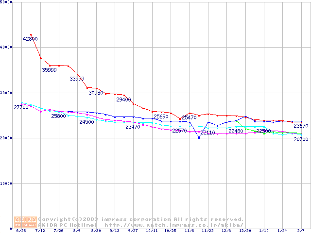 | [↓次グラフ]: | 2.5インチHDD 20GB~40GB未満(9.5mm厚)の最安値推移 |