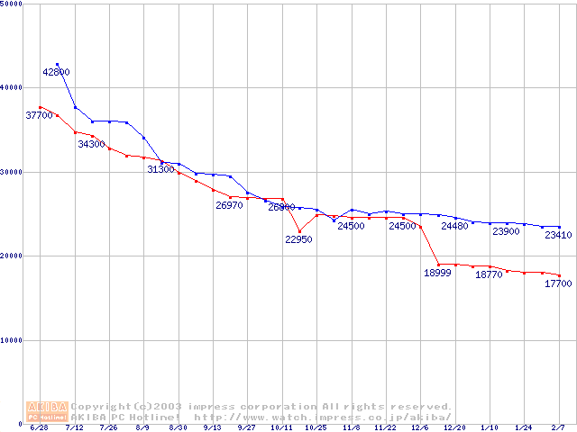 | [↑前グラフ]: | 2.5インチHDD 40GB~50GB未満(9.5mm厚,5400rpm)の最安値推移 |