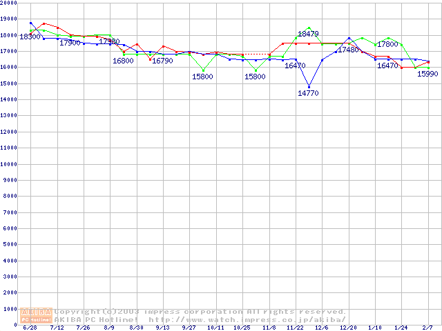 | [↑前グラフ]: | 2.5インチHDD 50GB~60GB以下(9.5mm厚,7200rpm)の最安値推移 |