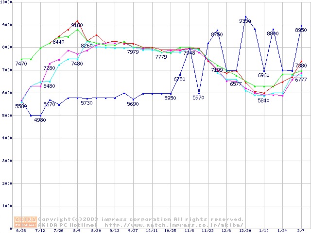 メモリ主要製品(最安値5千円~1万円未満)の最安値推移