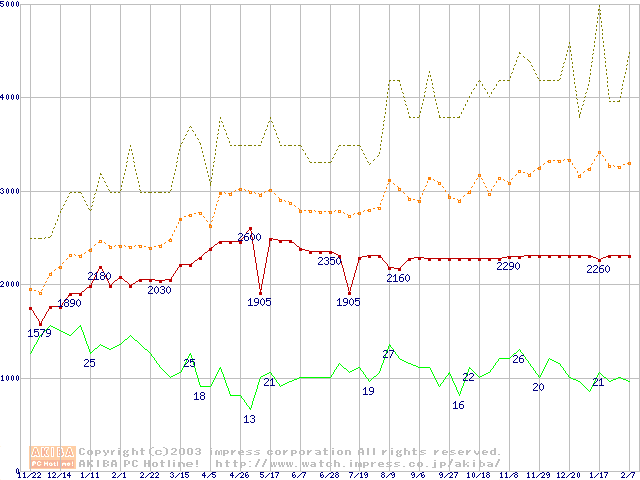 PC100 SDRAM DIMM CasLatency=2の最安値推移