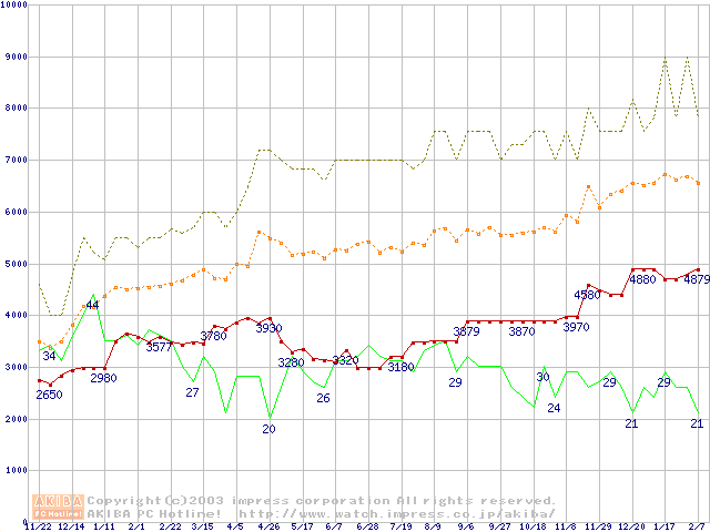PC100 SDRAM DIMM CasLatency=2の最安値推移
