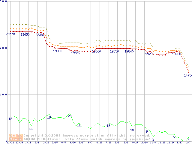 Socket 478 (micro-PGA,FSB 400MHz,L2 512KB,Northwood)の最安値推移