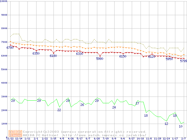 Socket 478 (micro-PGA,FSB 400MHz,L2 128KB,Willamette)の最安値推移