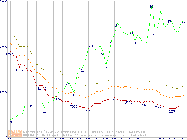 PC3200(DDR400) DDR SDRAM DIMMの最安値推移