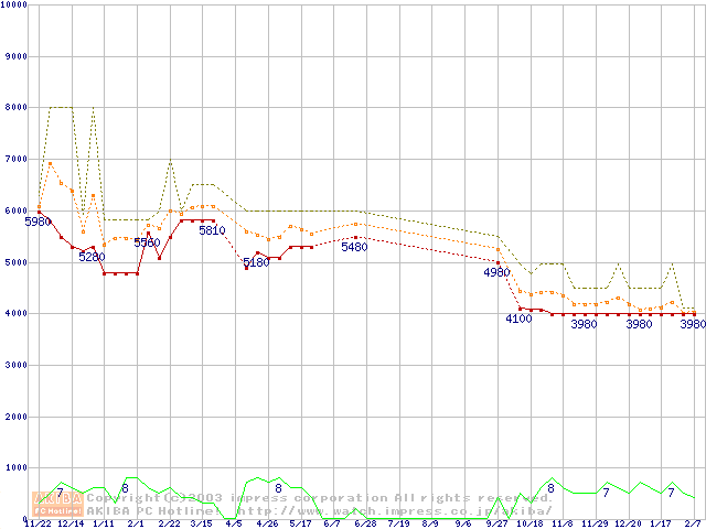 Socket 370 (FC-PGA,FSB 100MHz,L2 128KB,Coppermine)の最安値推移