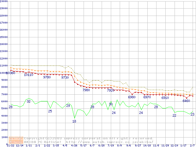 Socket 478 (micro-PGA,FSB 400MHz,L2 128KB,Northwood)の最安値推移