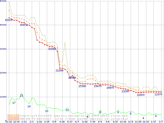 Socket A (OPGA,FSB 333MHz,L2 256KB,Thoroughbred)の最安値推移