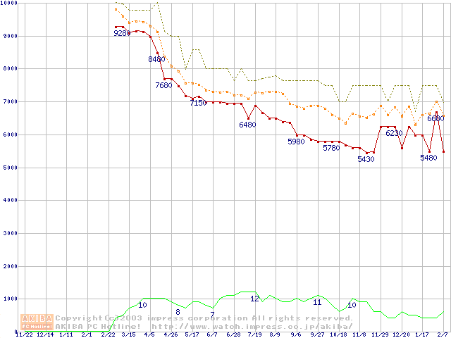 Socket A (OPGA,FSB 266MHz,L2 256KB,Thoroughbred)の最安値推移