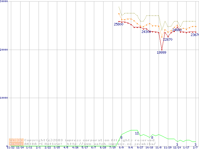 MHT20x0ATシリーズ (9.5mm,4200rpm,UltraATA/100,2MB,FDB,40GB/Platter,FDB)の最安値推移