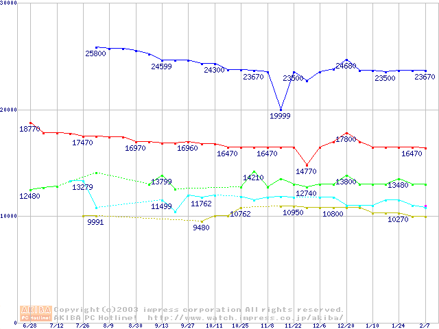 | [↑前グラフ]: | MHT20x0AHシリーズ (9.5mm,5400rpm,UltraATA/100,8MB,FDB,40GB/Platter,FDB)の最安値推移 |