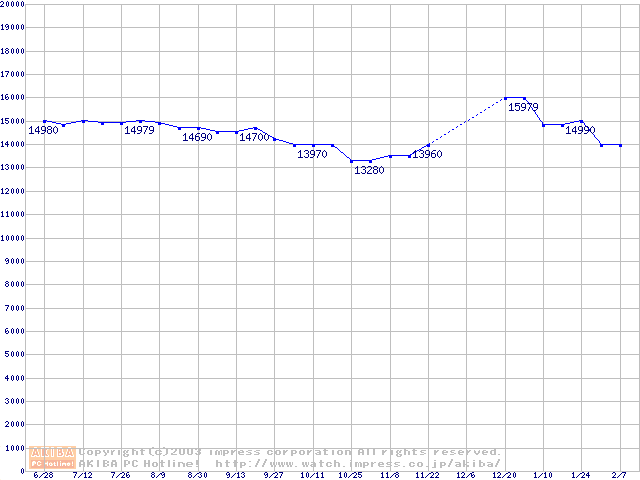 | [↑前グラフ]: | Travelstar 5K80 (9.5mm,5400rpm,UltraATA/100,8MB,FDB,40GB/Platter)の最安値推移 |