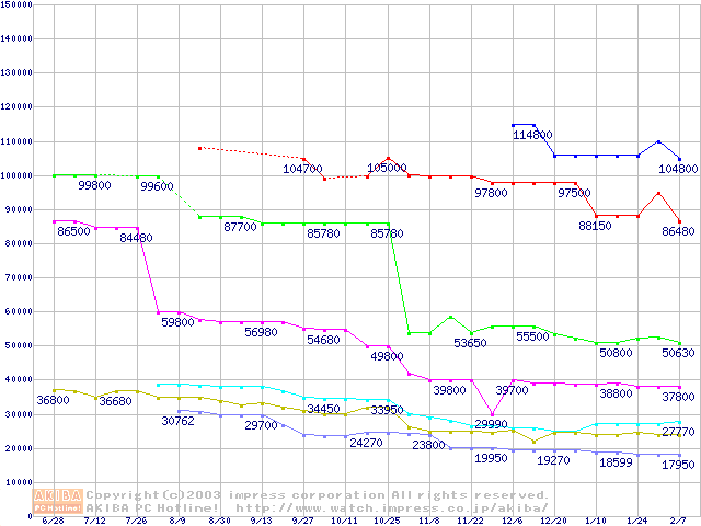 | [↓次グラフ]: | Socket A (OPGA,FSB 400MHz,L2 512KB,Barton)の最安値推移 |