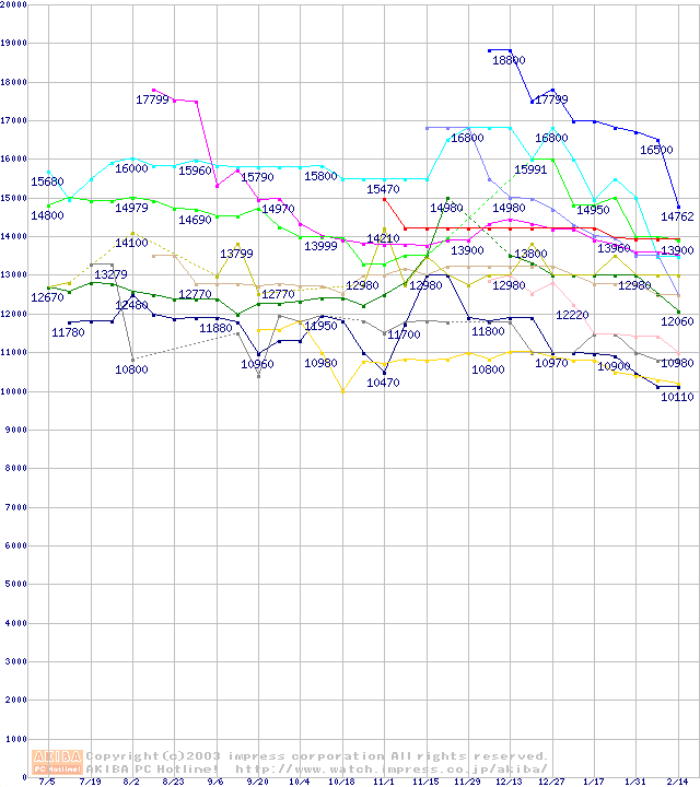 2.5インチHDD主要製品(最安値1万5千円~2万円未満)の最安値推移